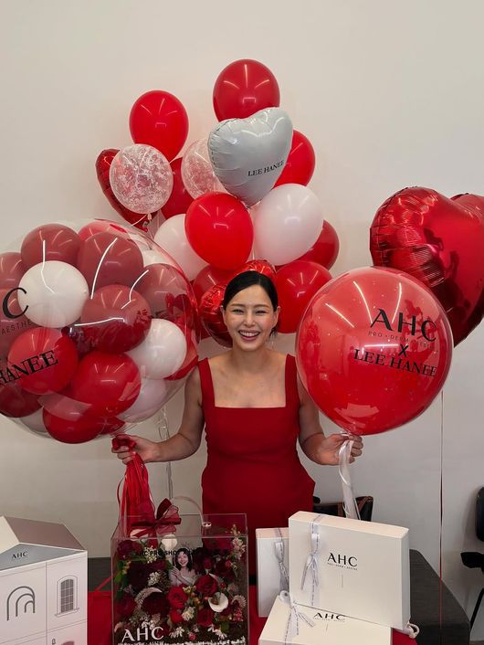 공개된 사진 속 이하늬는 붉은색 드레스를 입고 화장품 브랜드명이 적힌 풍선과 제품들이 가득한 촬영장에서 환하게 미소 짓고 있다.