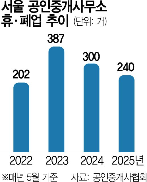 25일 한국공인중개사협회에 따르면 올해 5월 서울 공인중개사무소 중 휴·폐업한 곳은 총 240곳으로 전월(272곳) 대비 약 12% 감소했다. 이는 5월 기준 전국 집값이 상승기였던 2022년(202곳) 이후 3년 만에 가장 적은 규모다.
