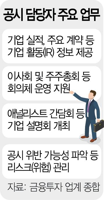 현재 상장사의 공시 업무 교육은 협회 차원에서 이뤄진다. 다만 교육의 실질적인 효과는 기대하기 어렵다는 설명이다. 상장사의 또 다른 관계자는 “통상 내부 인력 중 공시 담당자를 뽑아 실전에 투입하면서 업무를 익히는 상황”이라며 “보다 체계적인 교육·훈련 프로그램 지원이 필요하다”고 말했다.