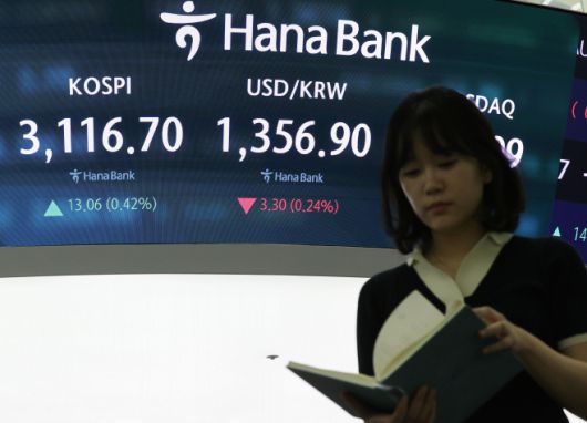 25일 서울 중구 하나은행 본점 딜링룸에서 직원들이 업무를 보고 있다. /연합뉴스 |