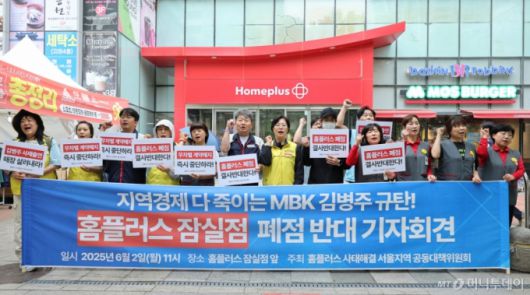 홈플러스 사태 해결을 위한 공동대책위원회 회원들이 2일 오전 서울 송파구 홈플러스 잠실점 앞에서 가진 기자회견에서 잠실점·자영점 폐점을 반대하고 있다. 이들은 노동자와 지역주민, 상인들이 함께 살아온 삶의 터전을 폐점한다는 것은 지역 전체의 생존을 위협하는 행위라며 폐점 저지를 위한 투쟁에 돌입한다고 밝혔다. 2025.6.2/뉴스1 Copyright (C) 뉴스1. All rights reserved. 무단 전재 및 재배포, AI학습 이용 금지. /사진=뉴스1 |