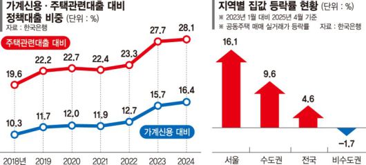 실제 정책대출 상품과 공급 대상이 꾸준히 늘면서 정책대출의 가계신용 대비 비중은 2015년 말 9.0%에서 지난해 말 16.4%까지 커졌고, 주택관련 대출 대비 비중도 같은 기간 16.9%에서 28.1%로 확대됐다.