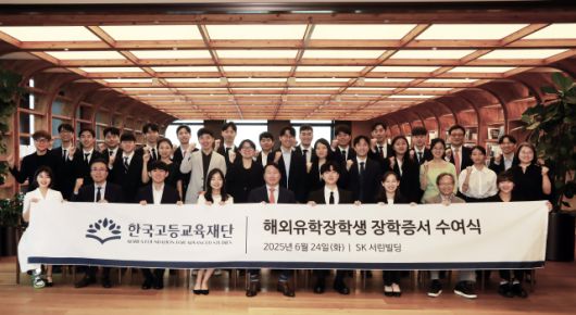 SK그룹은 최태원 회장이 24일 서울 종로구 SK서린빌딩에서 한국고등교육재단 지원으로 해외 유학을 떠나는 장학생들에게 장학증서를 수여하며 이같이 당부했다고 25일 밝혔다. 이날 행사에는 해외 유학 장학생 26명과 김유석 한국고등교육재단 대표 등 재단 관계자들이 참석했다.