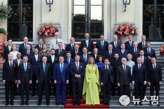 [헤이그 로이터=뉴스핌] 장일현 특파원 = 나토(NATO·북대서양조약기구) 정상회의가 24~25일 32개국 정상들이 참석한 가운데 네덜란드 헤이그에서 열렸다. 사진은 24일 네덜란드의 빌럼 알렉산더 국왕과 막시마 왕비가 각국 정상들과 기념사진을 찍는 모습. 2025.06.25 ihjang67@newspim.com |