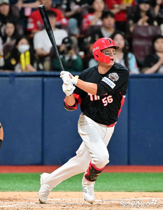 (엑스포츠뉴스 고척, 김한준 기자) 25일 오후 서울 구로구 고척스카이돔에서 열린 '2025 신한 SOL Bank KBO리그' KIA 타이거즈와 키움 히어로즈의 경기, 4회초 무사 1루 KIA 오선우가 우전안타를 날리고 있다.김한준 기자 kowel@xportsnews.com
