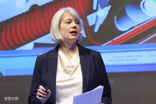 지나 네프 영국 케임브리지대 민더루 기술·민주주의 센터장이 25일 서울 중구 롯데호텔에서 열린 <2025 경향포럼>에서 기조 강연을 하고 있다. 이준헌 기자 |