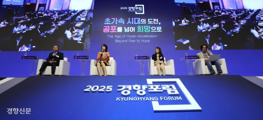 보 안 싱가포르 난양공대 컴퓨터과학과 석좌교수, 김지희 카이스트 경영대학 기술경영학부 교수, 김효은 국립한밭대 인문교양학부 교수는 25일 서울 중구 롯데호텔에서 ‘초가속 시대의 도전 - 공포를 넘어 희망으로’를 주제로 열린 <2025 경향포럼> 세 번째 세션 토론자로 나서 이에 관해 심도 있게 토론했다. 진행은 김재인 경희대 비교문화연구소 교수가 맡았다.