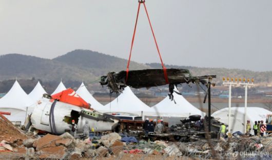 (무안=뉴스1) 박지현 기자 = 15일 오후 전남 무안국제공항 여객기 참사 현장에서 절단된 기체동체 잔해물이 공중에 들어올려 지고 있다. 2025.1.15/뉴스1 Copyright (C) 뉴스1. All rights reserved. 무단 전재 및 재배포, AI학습 이용 금지. /사진=(무안=뉴스1) 박지현 기자 |