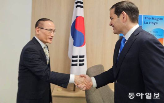위성락 대통령실 국가안보실장이 25일(현지시간) 네덜란드 헤이그에서 마코 루비오 미국 국무장관 겸 국가안보보좌관과 악수하고 있다. 대통령실 제공 |