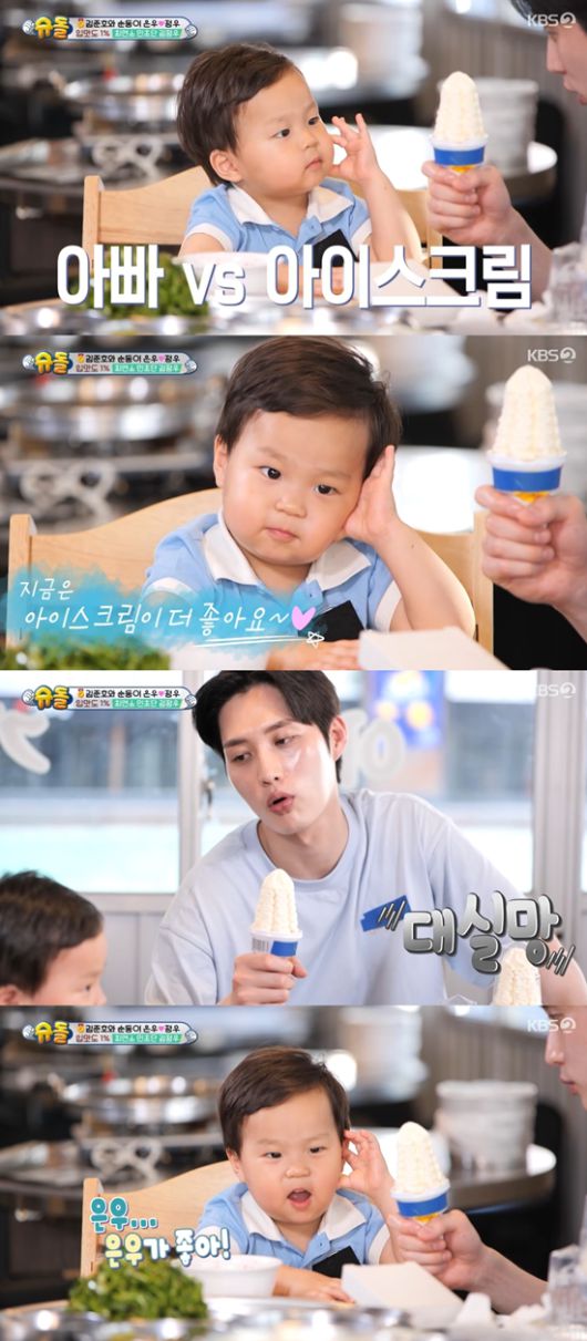 서운한 김준호는 "은우 형이 좋아 아이스크림이 좋아"라고 물었다. 정우는 형 은우를 골랐다. 김준호는 포기하지 않고 "아빠가 좋아 아이스크림을 좋아"라고 물었지만 정우는 보기에도 없는 엄마를 골랐다.