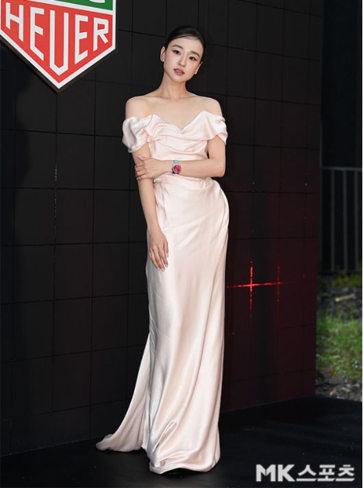 살구빛 오프숄더 드레스에 강렬한 핑크 다이얼 시계, 모던한 미니멀 메이크업까지, ‘첫돌맘’의 드레스업은 이토록 우아했다.