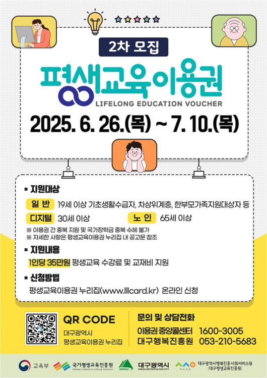 [박용 기자] [포인트경제] 대구시는 오는 26일부터 다음달 10일까지 디지털 교육 수요자, 노인 및 저소득층을 대상으로 '2025년 대구시 평생교육 이용권' 이용자를 2차 모집한다고 25일 밝혔다.