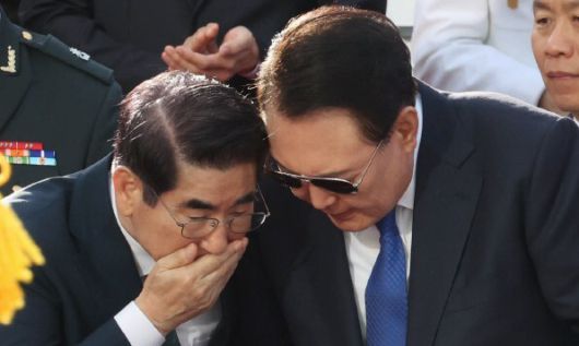지난해 10월1일 국군의날 기념식에서 김용현 전 국방부 장관과 윤석열 전 대통령이 은밀한 대화를 나누고 있다. 김태형 기자 |