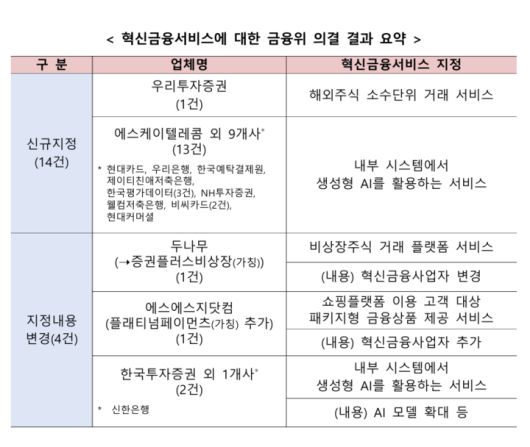 신규 지정된 혁신금융서비스에는 우리투자증권의 '해외주식 소수단위 거래 서비스'와 에스케이텔레콤을 비롯한 9개 기업의 '내부 시스템에서 생성형 AI를 활용하는 서비스'가 포함된다.