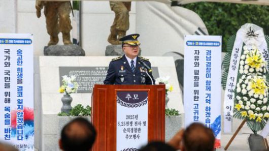 김성희 경남경찰청장이 6·25전쟁 전사 및 순직 경찰관 추모행사에서 추도사를 전하고 있다. 경남경찰청 제공 |