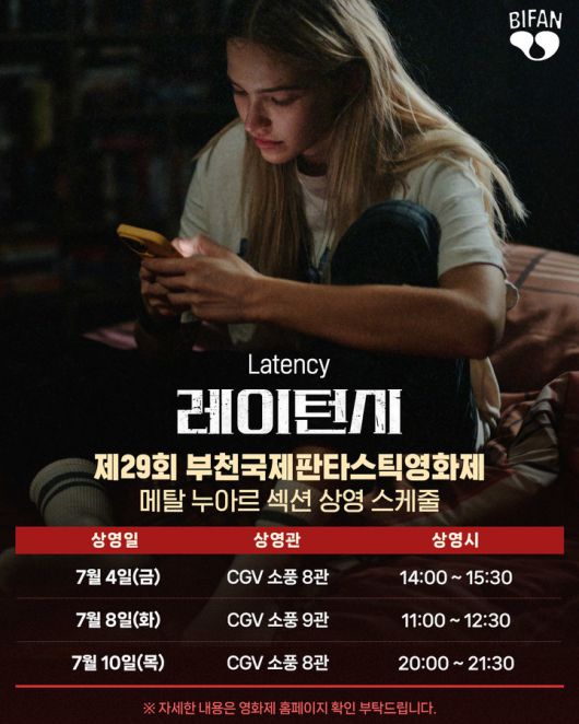 한편, 이번 영화제에서 아시안 프리미어로 공개되는 '레이턴시'는 오는 7월 4일 CGV 소풍 8관, 7월 8일 CGV 소풍 9관, 7월 10일 CGV 소풍 8관에서 총 3회 상영된다.