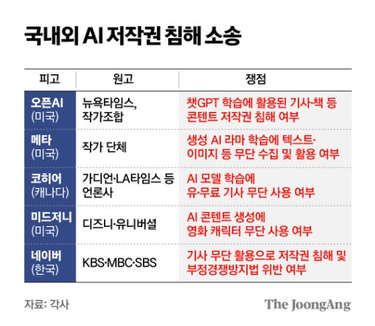 국내에서도 AI 훈련을 둘러싼 법적 분쟁이 진행 중이다. 올초 지상파 방송사들은 AI 학습에 기사를 무단으로 활용했다며 네이버를 상대로 저작권 침해 및 부정경쟁방지법 위반 소송을 제기했다. 지난 4월 한국신문협회는 같은 이유로 네이버를 공정거래위원회에 신고한 바 있다. 양진영 변호사(법무법인 민후)는 “미국에서 많은 선례가 있었던 변형적 이용은 저작권 침해 여지를 굉장히 좁게 보는 것”이라면서 “국내는 좀더 보수적으로 보는 편이라 미국과는 분위기가 많이 다르다”고 말했다. “공정 이용의 법리가 국내서 진행 중인 AI 관련 소송에서 적용될지 여부는 지켜봐야 할 것”이라고 덧붙였다.