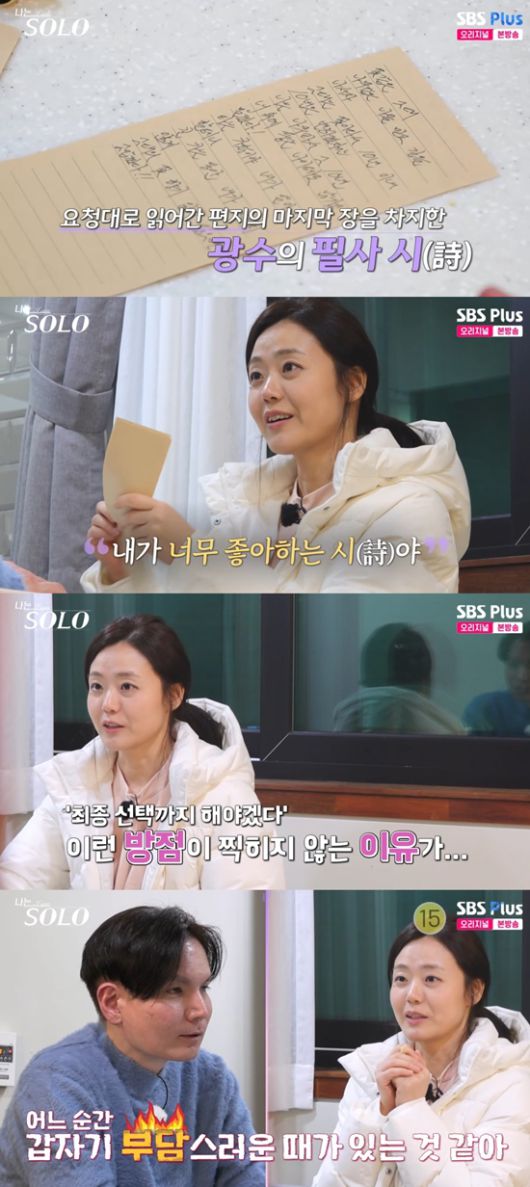 현숙은 "광수 님이 되어 주고 싶은 사람이 내가 필요한 사람인 건 맞는 것 같다"라고 말했다. 또 그는 "이런저런 생각이 든다. 광수 님이 이렇게 잘해주시기도 하고 나한테 좋은 사람인 걸 알면서도 '최종 선택까지 해야겠다' 방점이 찍히지 않는 이유가 아까 전처럼 부담스러울 때가 있다"라며 솔직한 마음을 고백했다.