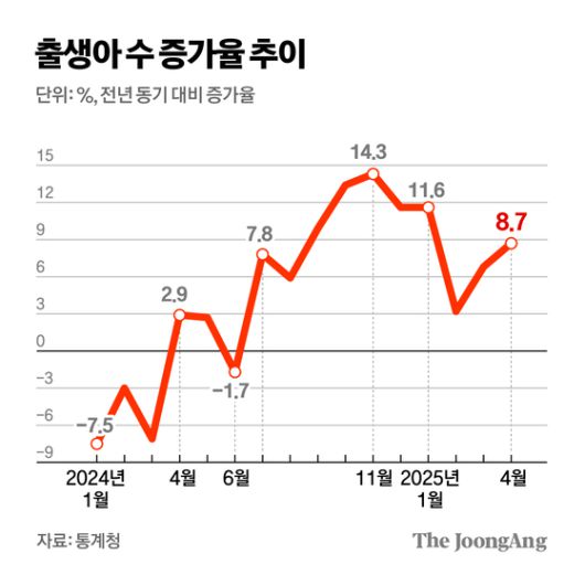 25일 통계청의 ‘인구동향’에 따르면 4월 태어난 아이는 2만717명으로 1년 전(1만9059명)보다 8.7%(1658명) 늘었다. 4월 기준으로 출생아 수가 2만 명을 넘어선 건 2022년 이후 3년 만이다. 전년 대비 4월 기준 증가 인원은 2011년(2040명) 이후 14년 만에 가장 많았고, 증가율(8.7%)은 1991년(8.7%) 이후 34년 만에 가장 높았다.