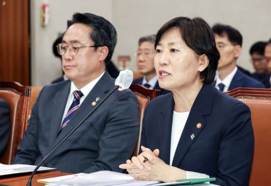 송미령 농림축산식품부 장관(오른쪽)이 25일 오후 국회에서 열린 농해수위 전체회의에 출석해 장관직 유임에 따른 입장을 밝히고 있다. 김성룡 기자 |