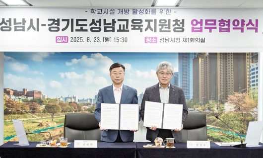 신상진 성남시장(왼쪽)과 한양수 경기도성남교육지원청 교육장이 ‘학교시설 개방 활성화에 관한 업무 협약서’를 들고 기념촬영을 하고 있다. 성남시 제공 |