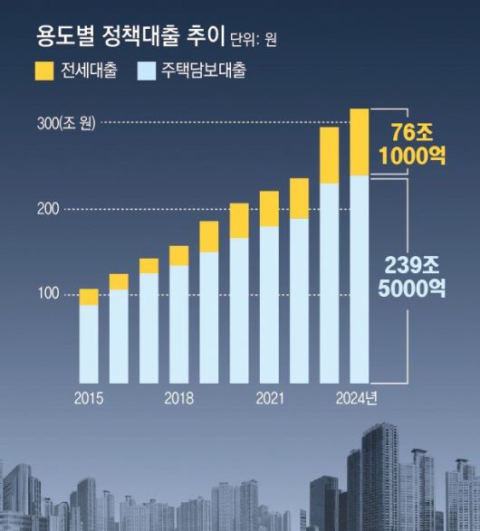 보고서에 따르면 지난해 말 가계에 대한 주택정책금융 중 정책대출이 315조6000억 원, 공적보증이 598조8000억 원에 달하는 것으로 집계됐다. 정책대출에서 75.9%는 주택담보대출, 24.1%는 전세대출이다. 공적보증에서는 절반에 가까운 48.1%가 전세 관련 보증으로 나타났다.