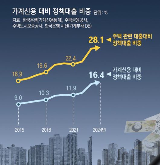 실제로 정책대출 상품과 공급 대상은 꾸준히 늘어나는 추세로 정책대출의 전체 가계신용 대비 비중은 2015년 말 9.0%에서 작년 말 16.4%까지 커졌다. 주택 관련 대출 대비 비중도 같은 기간 16.9%에서 28.1%로 확대됐다.