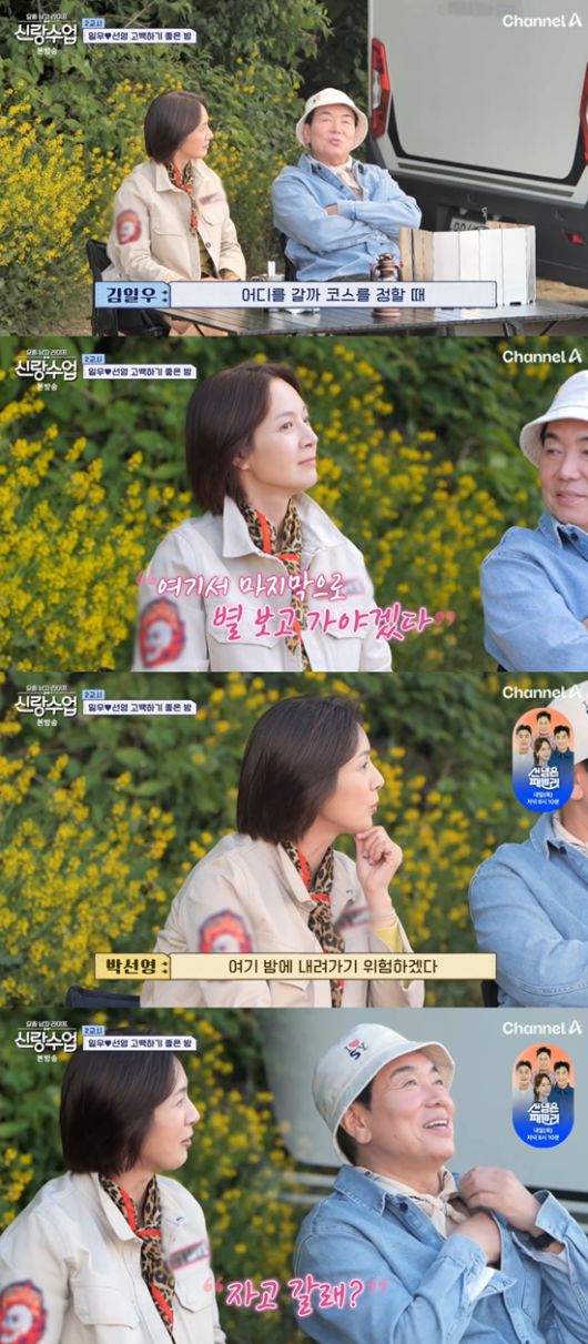 이어 그는 "여기가 별이 잘 보이는 이유가 불빛이 없어서다"라고 말했다. 박선영은 "어떻게 보면 첩첩산중에 우리가 있는 거다. 여기 밤에 내려가기 위험하겠다"라고 덧붙였다. 박선영은 "자꾸 캠핑카에서 (오늘도) 잔다고 생각한다"라고 말했다. 이에 김일우는 "자고 갈래?"라며 자연스럽게 물었다.