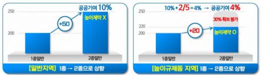 일반지역은 용도지역 1단계 상향 시 일률적으로 종상향 면적의 10%만큼 공공기여를 해야 한다. 하지만 앞으로는 높이규제로 인해 개발가능 밀도가 제한되는 지역은 추가 확보된 용적률만큼만 공공기여를 하면 된다. 사업실현성 확보를 위해 필요하다고 인정되는 경우에는 위원회 심의를 거쳐 이보다 더 완화된 공공기여율을 적용할 수도 있도록 했다.