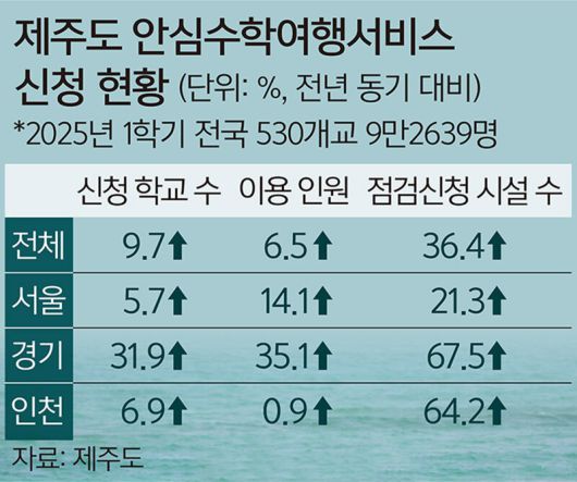 올해 1학기 제주도로 수학여행을 가기로 신청한 학교 및 학생 수가 수도권을 중심으로 모두 늘었다. 제주도가 세월호 참사 이후 도입한 ‘안심수학여행서비스’로 전국 수학여행지 중 가장 신뢰받는 안전관리 모델로 자리매김했다는 평가가 나온다.