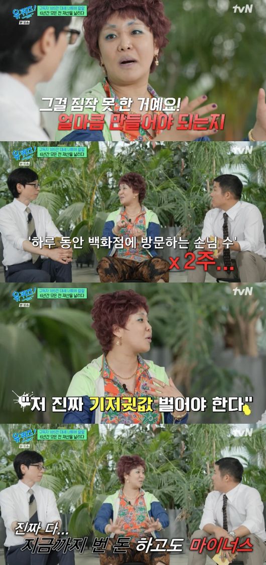 놀란 유재석과 조세호가 “총 물량 얼마나 했냐”라고 묻자 “그건 말씀 드릴 수 없는데 제가 6년간 벌어왔던 돈을 다 날렸다. 저 진짜 기저귀값 벌어야 한다”라며 “이것저것 만들다 보니까 50가지가 됐다. 거기에 서울 2주, 부산 2주를 곱했다”라고 토로했다.