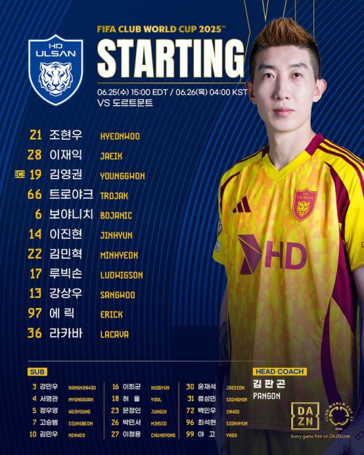 울산은 26일(한국시간) 미국 신시내티의 TQL 스타디움에서 열린 2025 국제축구연맹(FIFA) 클럽 월드컵 조별리그 F조 3차전에서 보루시아 도르트문트(독일)에 0-1로 졌다.