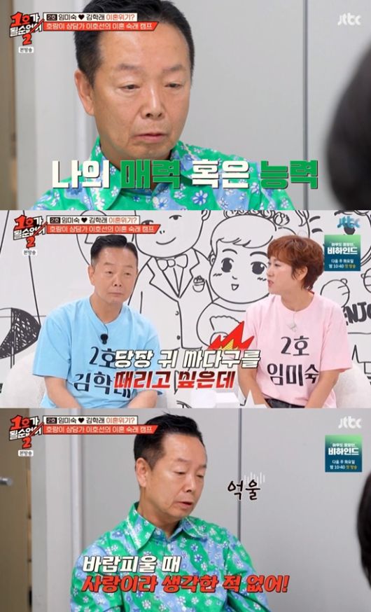김학래는 "나의 어떤 매력이나 능력을 보지 않았을까. 탕진했던 재산도 원상복구를 넘어서 흑자전환했다. 매력은 성실함"이라고 말했다. 이를 스튜디오에서 지켜보던 임미숙은 "너무 충격"이라며 "도박 성실, 바람 성실, 보증 성실이 매력인 거냐. 이 나이에 무슨 매력이냐. 당장 귀 싸다구를 때리고 싶다"고 격분했다.