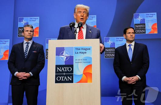 도널드 트럼프 미국 대통령이 25일(현지시간) 네덜란드 헤이그에서 열린 북대서양조약기구(NATO, 나토) 정상회의 후 피트 헤그세스 국방부 장관, 마코 루비오 국무부 장관이 참여한 가운데 기자회견을 하고 있다. 2025.06.25 ⓒ 로이터=뉴스1 ⓒ News1 류정민 특파원 |