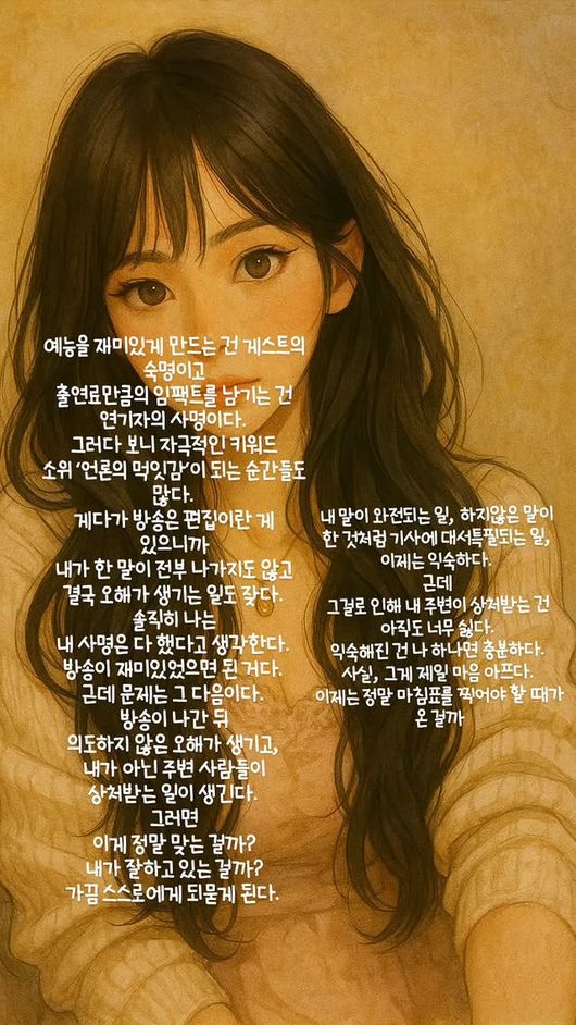 이어 “솔직히 나는 내 사명은 다 했다고 생각한다. 방송이 재미있었으면 된 거다. 근데 문제는 그 다음이다. 방송이 나간 뒤 의도하지 않은 오해가 생기고, 내가 아닌 주변 사람들이 상처받는 일이 생긴다. 그러면 이게 정말 맞는 걸까? 내가 잘하고 있는 걸까? 가끔 스스로에게 되묻게 된다"라며 "내 말이 와전되는 일, 하지않은 말이 한 것처럼 기사에 대서특필되는 일, 이제는 익숙하다. 근데 그걸로 인해 내 주변이 상처받는 건 아직도 너무 싫다. 익숙해진 건 나 하나면 충분히다. 사실, 그게 제일 마음 아프다. 이제는 정말 마침표를 찍어야 할 때가 온 걸까”라고 덧붙였다.