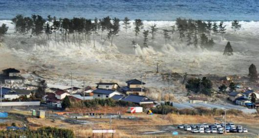 지난 2011년 일본 도호쿠 지방 부근 해저에서 일어난 대규모 강진으로 미야기현 나토리시 마을에 쓰나미가 덮치고 있다. 연합뉴스 |