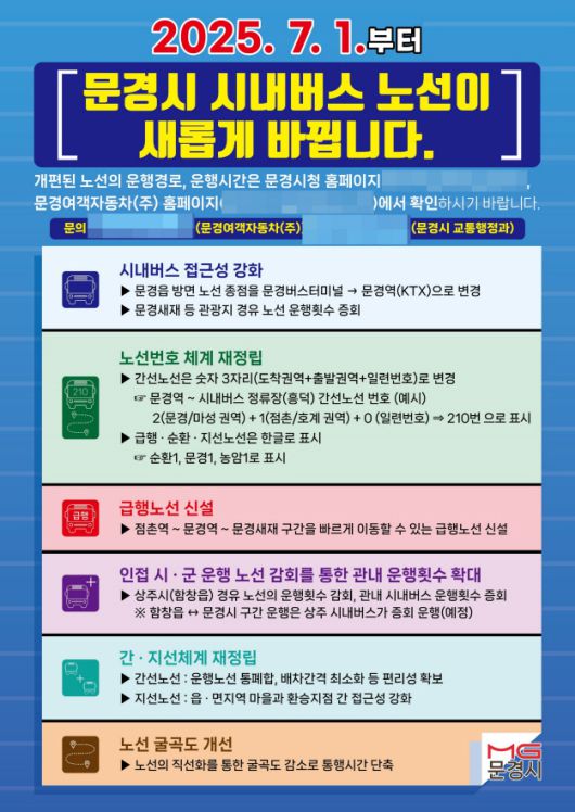 시내버스 노선번호 체계는 기존 2자리에서 간선노선은 첫 자리는 도착권역을 두 번째 자리는 출발권역 의미하는 3자리 숫자로 변경했고, 급행·지선·순환노선은 급행1, 문경1, 순환1 등 한글로 표현해 쉽게 인식할 수 있도록 했다.