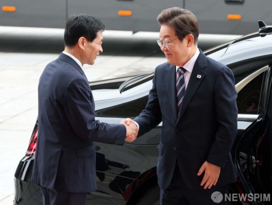 [서울=뉴스핌] 국회사진기자단 = 이재명 대통령이 26일 서울 여의도 국회에서 시정연설을 하기 위해 도착해 김민기 국회 사무총장과 인사를 나고 있다. 2025.06.26 photo@newspim.com
