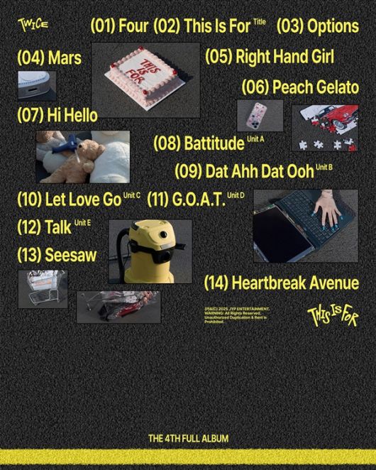 트와이스는 7월 11일 네 번째 정규 앨범 ‘THIS IS FOR’를 발매한다. 이에 앞서 JYP엔터테인먼트는 6월 26일 0시 트와이스 공식 SNS 채널에 트랙리스트 이미지와 함께 신보에 실리는 전곡 곡명을 공개했다.