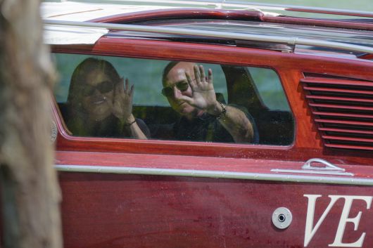 제프 베이조스 아마존 창업자가 25일(현지시간) 예비 신부와 함께 결혼식이 열리는 이탈리아 베네치아에 도착해 보트 안에서 손을 흔들고 있다. AP연합뉴스 |