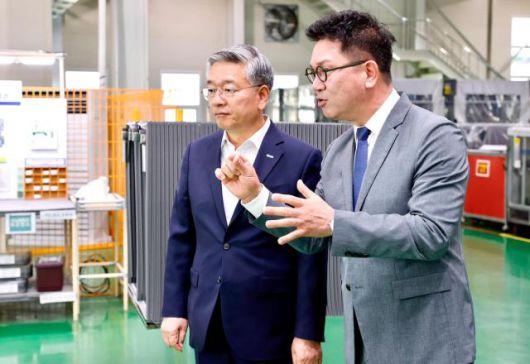 김종호 기보 이사장(왼쪽)이 정웅용 (주)광원이엔지 대표와 함께 제조시설을 둘러보고 애로사항을 청취하고 있다. [사진=기술보증기금] |