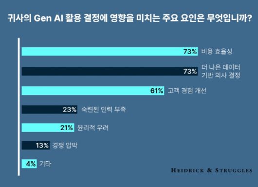 기업들이 Gen AI 도입을 결정하는 주요 요인은 ▲비용 효율성(73%) ▲데이터 기반 의사결정 강화(73%) ▲고객 경험 개선(61%)으로 나타났다. 이는 Gen AI를 단순한 자동화 도구가 아니라, 경쟁력 강화의 전략적 수단으로 인식하고 있다는 점을 보여준다.
