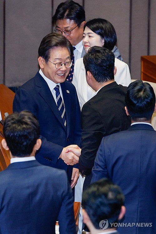 (서울=연합뉴스) 이재명 대통령이 26일 서울 여의도 국회 본회의장에서 정부의 2차 추가경정예산안 제출과 관련해 첫 시정연설을 마치고 국민의힘 의원들과 인사하고 있다. 2025.6.26 [국회사진기자단]