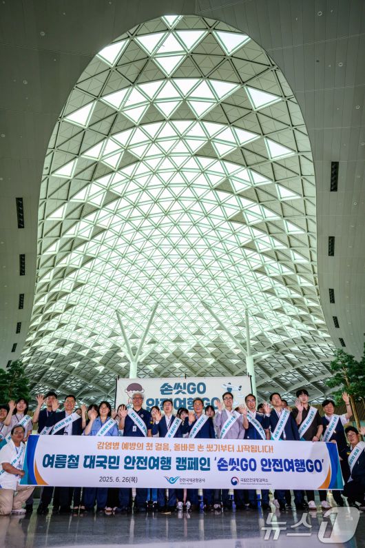 (인천공항=뉴스1) 장수영 기자 = 이학재 인천국제공항공사 사장과 직원들이 26일 인천국제공항 제2여객터미널 출국장에서 '여름 휴가철 맞이 안전여행 캠페인'을 하고 있다. (공동취재) 2025.6.26/뉴스1presy@news1.krCopyright ⓒ 뉴스1. All rights reserved. 무단 전재 및 재배포, AI학습 이용 금지.