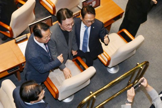 ▲김민석 국무총리 후보자가 26일 이재명 대통령의 추경 시정연설이 열리는 국회 본회의장에서 박선원 의원 등과 기념촬영 하고 있다. ⓒ연합뉴스 |