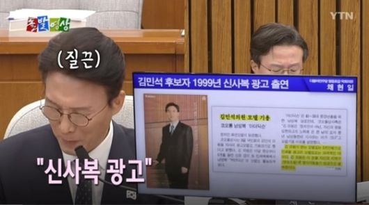 김민석 국무총리 후보자가 지난 24일 국회 인사청문회에서 26년 전 신사복 광고 모델에 관한 질의를 받자 두 눈을 질끈 감고 있다. 〈사진=유튜브 YTN 시사 캡처〉 |