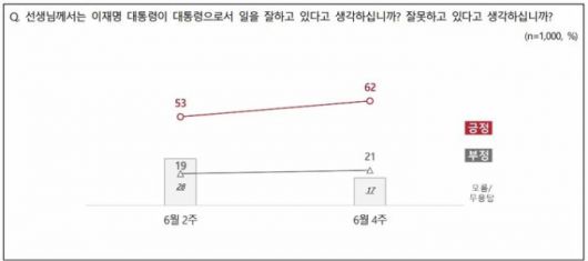 엠브레인퍼블릭·케이스탯리서치·코리아리서치·한국리서치가 지난 23일부터 25일까지 만 18세 이상 남녀 1000명을 대상으로 진행한 전국지표조사(NBS) 결과에 따르면 이 대통령의 국정운영에 대해 '잘하고 있다'는 긍정적 평가는 62%, '잘못하고 있다'는 부정적 평가는 21%로 집계됐다. 모름·무응답은 17%였다.