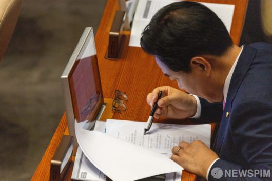 [서울=뉴스핌] 국회사진기자단 = 송언석 국민의힘 원내대표가 26일 국회 본회의장에서 열린 이재명 대통령의 2025년도 제2회 추가경정예산안에 대한 정부의 시정연설을 들으며 메모를 하고 있다. 종이에 '내로남불'이라고 적혀있다. 2025.06.26 photo@newspim.com |