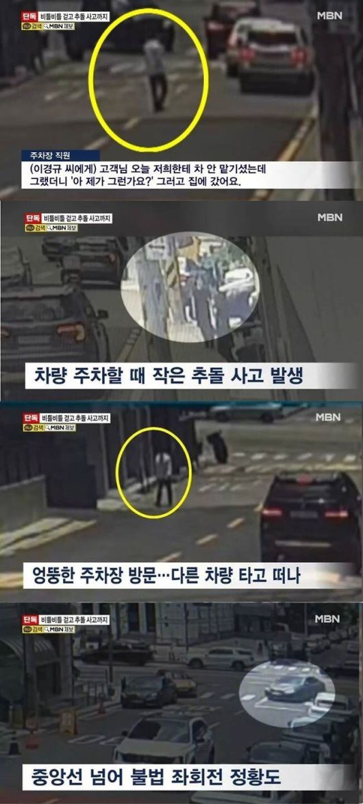 MBN이 25일 공개한 영상에 따르면 이경규는 지난 8일 서울 강남구 한 골목에서 주차된 버스를 들이받은 뒤 차량을 이동하는 과정에서 인도 대신 차도로 비틀거리며 걷는 모습이 포착됐다. 그의 돌발 행동으로 인해 뒤따르던 차량 2대는 중앙선을 넘어 운행했다.