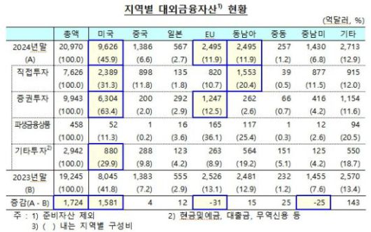 투자잔액으로 보면 미국에 이어 동남아시아(2495억달러·11.9%), 유럽연합(EU·2495억달러·11.9%) 순이었다. 미국을 제외하고는 전년 대비 증가세가 미미하거나 줄었다. 달러화 강세로 그 외 표시 자산들이 손실을 보인 영향이다. 중동(25억달러)과 동남아(15억달러)는 소폭 늘었고 EU(-31억달러)와 중남미(-25억달러)는 감소했다.
